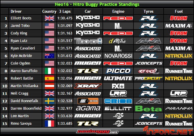 Jared Tebo consiguió la segunda posición en los entrenos de ayer, después de sufrir bastantes dificultades para poder enlazar tres vueltas rápidas en el tercer entreno. El piloto de Kyosho viene con grandes expectativas a esta Neo 16, afirmando en una entrevista que se encuentra “listo para ganar”. Hace tiempo que no vemos a Tebo ganar una carrera importante, así que esperamos que esta autoconfianza realmente sirva para que nos de un gran espectáculo en la final. El Top 3 lo cierra Cody King, poniendo así tres Kyoshos MP9 TKI4 en la cabeza de esta Neobuggy 2016
