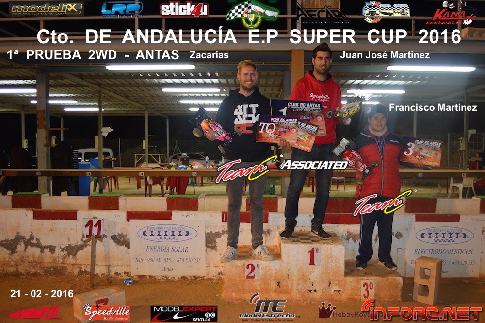 El pasado fin de semana, 21 de febrero, se dio el pistoletazo de salida al Cto. de Andalucía Electric Power Super Cup 2016 en Antas. El circuito presentaba un estado bueno, esfuerzo realizado por la organización y que desde aqui quiero agradecer. El tiempo amenazo con lluvia que final mente no llovio y nos dejo un fin de semana aceptable. La inscripción bastante bien, con un total de 63 en las 3 categorñias. Comienzan las mangas y con ellos los pilotos destacados fuerón Zcarias Villaba, Michel Todd, Jerome, Koke, etc.