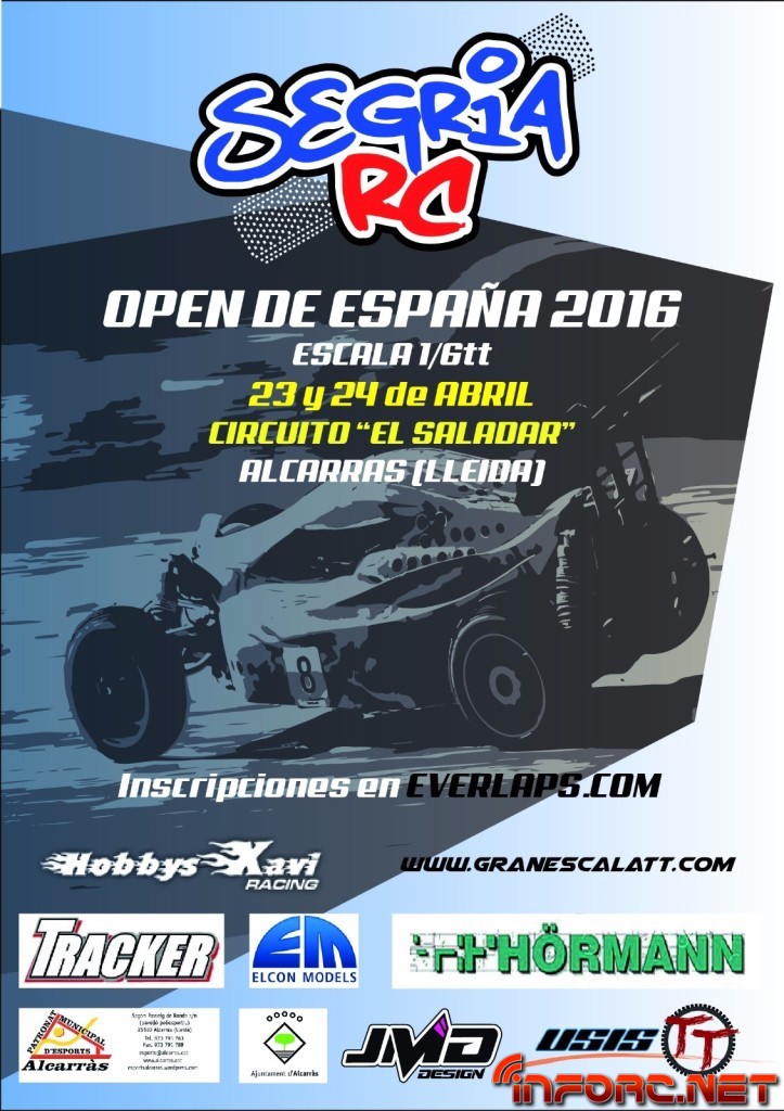 Los próximos 23 y 24 de Abril tendrá lugar la 1ª Prueba del Open de España 2016 1/6 TT que se celebrará en las instalaciones del Club Segrià RC(circuito “El Saladar”), en Alcarràs, Lleida. Es la primera prueba puntuable de un total de tres.