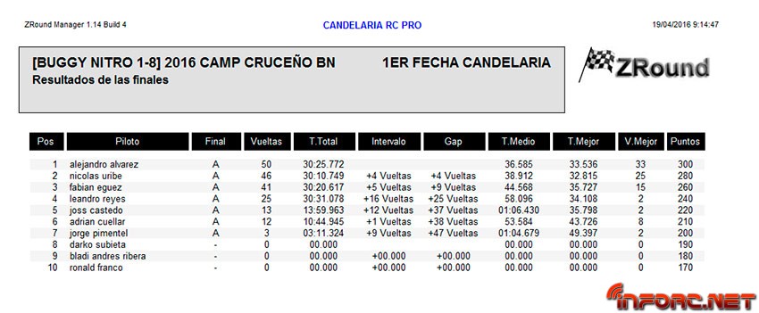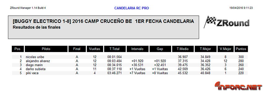 Fabian Eguez nos remite desde Bolivia los resultados de la primera prueba del Campeonato Cruceño FebolaRC 2016. Recuerda que puedes mandarnos las noticias de tu club a noticias@inforc.net