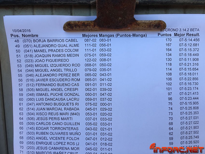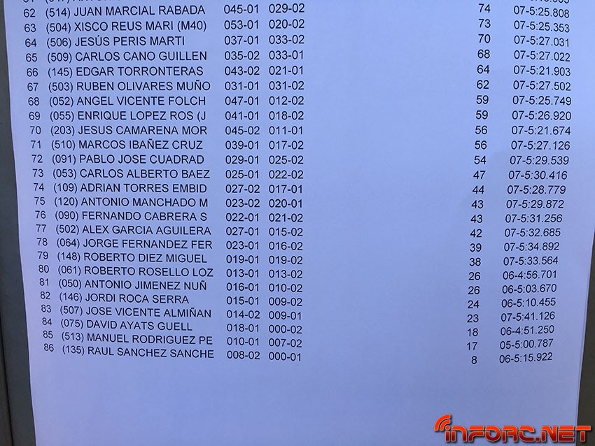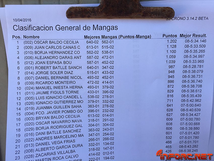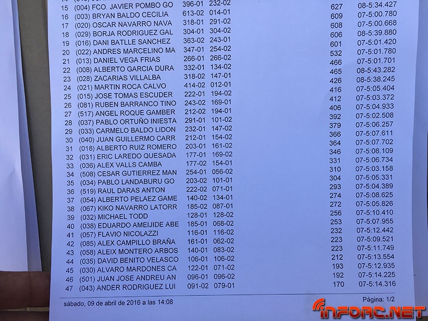 Tras una Q2 llena de incidentes para Robert Batlle, no ha podido repetir su actuación de la Q1 y ha bajado 5 puestos en la general de mangas, arrebatándole Oscar Baldó la pole. El más joven de los Baldó está rodando a muy buen ritmo, aunque no ha sido capaz de igualar los 5:28 de Batlle en la Q1 y se ha quedado en los 5:34. Le sigue en la general de mangas Juan Carlos Canas que está rodando muy fuerte en esta prueba, seguido de Borja Hernández, Alex Darás y Joan Espasa.