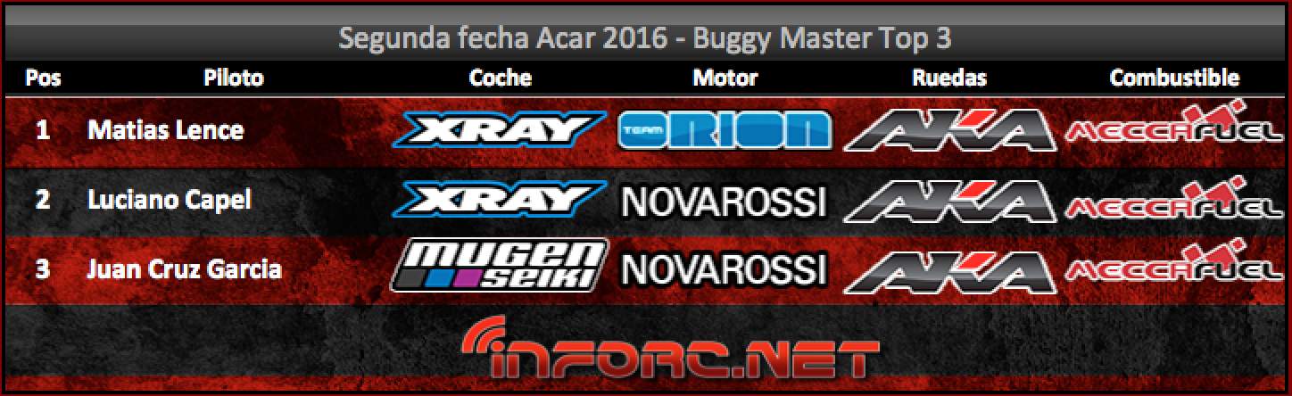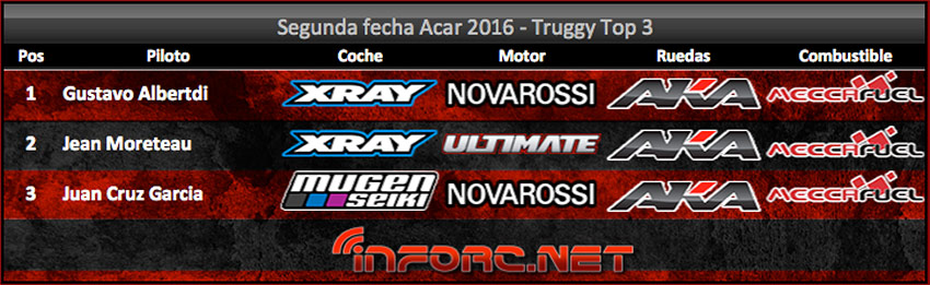 Por último y no menos importante se disputó la final de las Truggies, fue ganada sobradamente por el veterano piloto y distribuidor en Argentina de la marca Xray, el señor Gustavo Alberdi, seguido de Jean Moreteau y Juan Cruz García completando el podio. Este último tuvo una gran lucha por ese puesto con Gustavo Duarte durante toda la carrera.