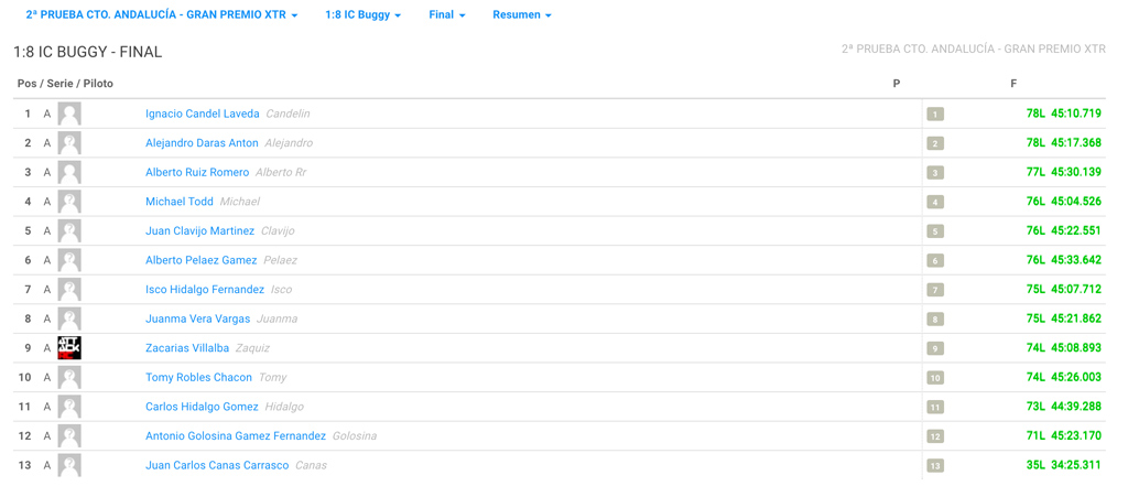 Ignacio Candel partia con el numero 1 en la final y Alex Daras gano la Final de Repesca, tras sufrir un problema en las semifinales con su servo del gas. Hasta el minuto 20 se vio una final muy bonita entre Ignacio Candel y Canas, seguido por Daras un poco mas rezagado tras salir desde muy atras. Un problema mecanico de Canas dejo la 2 posicion a Alejandro Daras y su increible remontada.