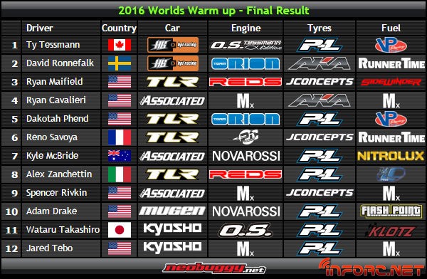 Como venía apuntando desde el principio, Ty Tessmann tenía muchas papeletas de llevarse este Warm Up a casa y así ha sido, aunque no de la forma que todos hubiésemos esperado. Desafortunadamente la final tuvo que cancelarse antes de comenzar debido a las lluvias que comenzaron en el circuito, a petición de los organizadores y con unanimidad entre los pilotos. Por tanto, se aplicó el resultado de la parrilla de salida de la final como resultado final del evento, llevándose Ty una primera posición que no habría conseguido de no ser porque la lluvia frenó a Ronnefalk en su semifinal. Completó el podio Ryan Maifield.