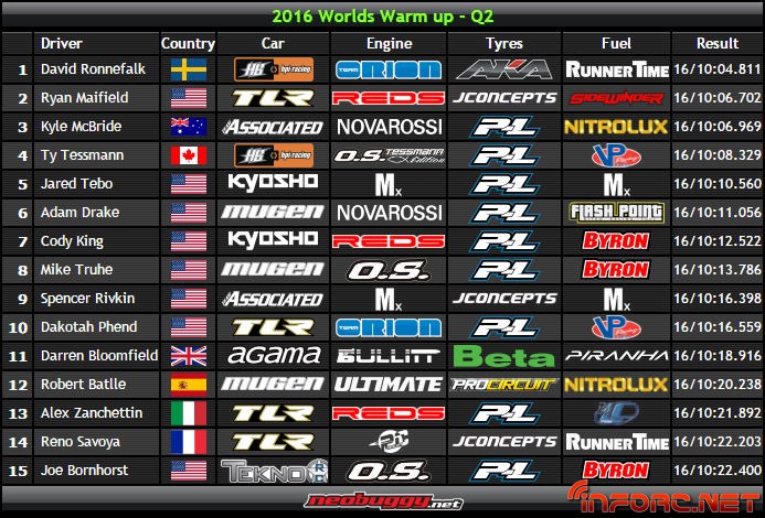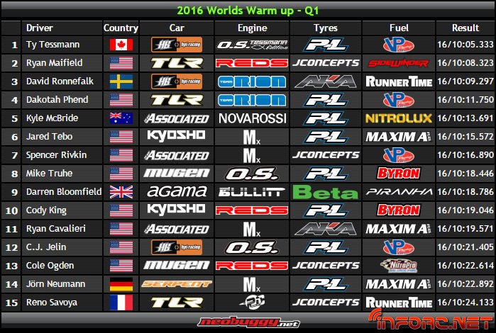 Ya se han disputado cuatro mangas clasificatorias del Warm Up del Campeonato del Mundo en el Circuito RC Las Vegas y los Hot Bodies de Tessmann y Ronnefalk se encargaron de dominarlas. En la Q1 Ty Tessmann se llevó la primera plaza tres segundos por delante de Maifield en un circuito en el que se debe tener muy en cuenta el nivel de humedad de la trazada según el momento, ya que tras cada manga se está regando y su evolución de mojado a seco afecta notablemente a cada tanda. Estos riegos frecuentes, como ya avisaron desde el Club hace unos días, están provocando que algunos pilotos corran con barro y que el circuito se esté bacheando bastante.