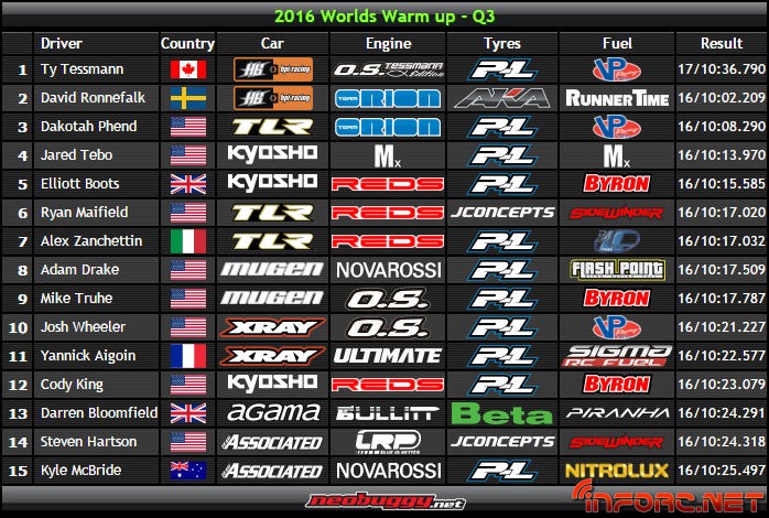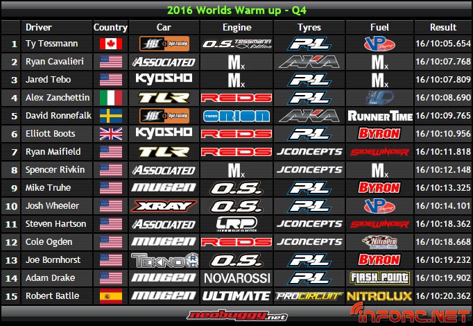 En la Q3 Tessmann fue el único piloto en dar las 17 vueltas en los 10 minutos de manga. Le siguieron con 16 Ronnefalk, Phend, Tebo y Boots. En la Q4 y a falta de una manga, Tessmann ya se aseguró la pole de este Warm Up del Mundo como se esperaba viendo su progresión durante las tandas, aunque no se puede dar nada por sentado en un circuito tan cambiante como este de Las Vegas. Aunque en esta manga no llegó a las 17 vueltas, volvió a quedar primero aunque en esta ocasión, su compañero de equipo Ronnefalk se fue más abajo a causa de una manga llena de fallos.