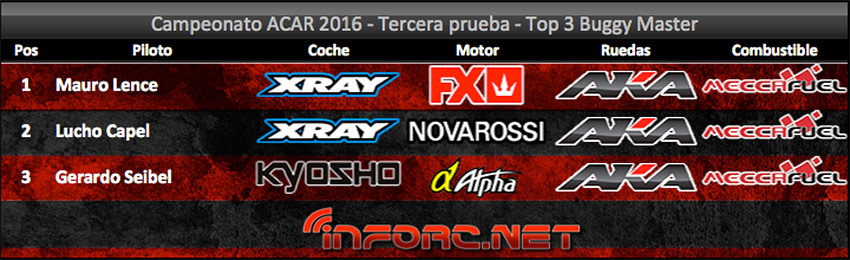 La final Buggy Master y Pro se corrieron juntas ya que sólo había 2 pilotos Pro, de los cuales Nico Bregante logró una sobrada victoria, en cambio el otro piloto Pro Nahuel Córdoba no tuvo la misma suerte debido a una rotura en su cuarta vuelta que lo detuvo en la carrera. En cuanto a los Pilotos Master la final comenzó con un gran desempeño en la punta por parte del Piloto Lucho Capel, pero tras media carrera aproximadamente se notó un pequeño bajón en su ritmo, por lo que fue sobrepasado por el debutante en esa categoría Mauro Lence, quien (al revés que Lucho) hizo un comienzo regular para ir poco a poco mejorando el ritmo.