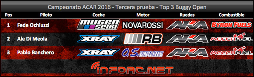 La final de Buggy Open fue muy intensa, con una lucha permanente por la 1º posición entre Alejandro Di Meola y Federico Ochiuzzi (La punta cambió 5 veces), se notaba sobre todo el nerviosimo por parte de los mecánicos, que incluso ambos pilotos coincidieron en las vueltas para repostar combustible. Fue ganada finalmente por el piloto Fede Ochiuzzi. Ambos lograron un manejo increíble, realmente digno de la categoría siguiente.