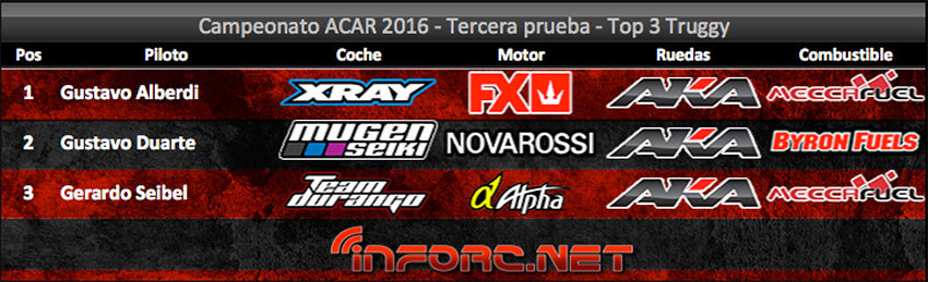 Por última la final de Truggies, como en la final Open, también mucha lucha por la primera posición, pero esta vez entre los pilotos Gustavo Alberdi y Tito Cañon. Lamentablemente una parada de motor cerca del final le costó a Tito Cañon descender hasta la cuarta posición, por lo que la victoria fue concedida para el veterano Gustavo “El Colo” Alberdi.
