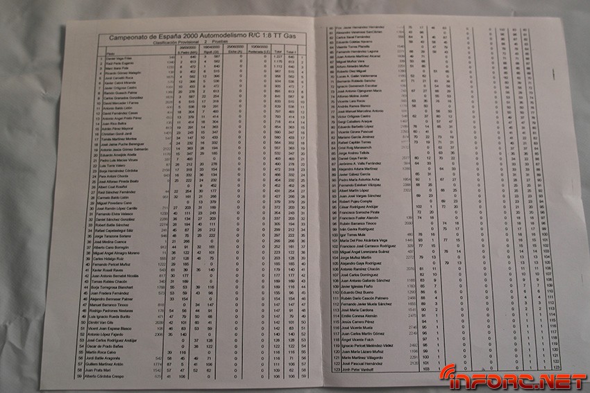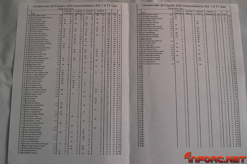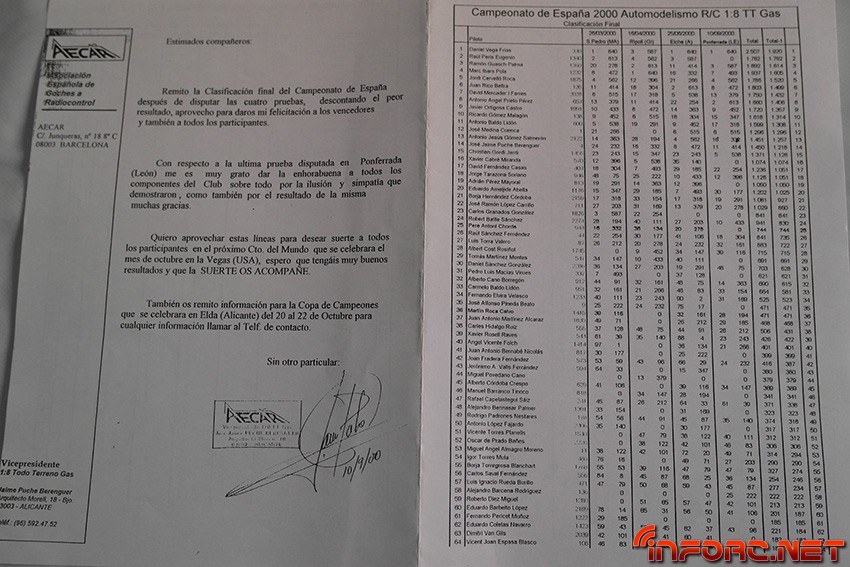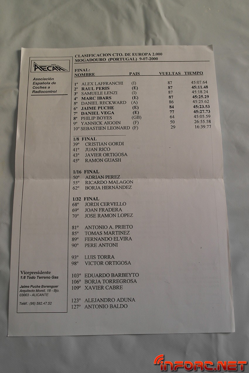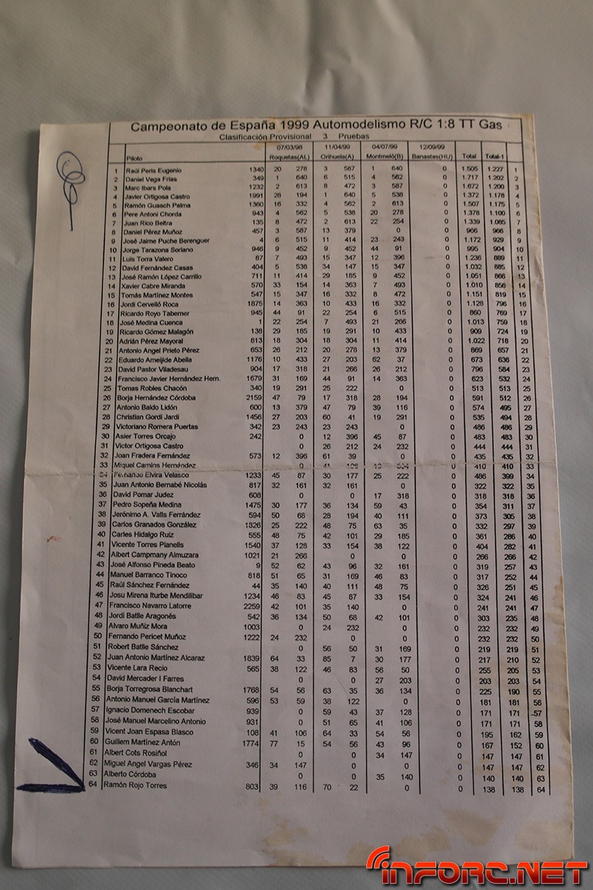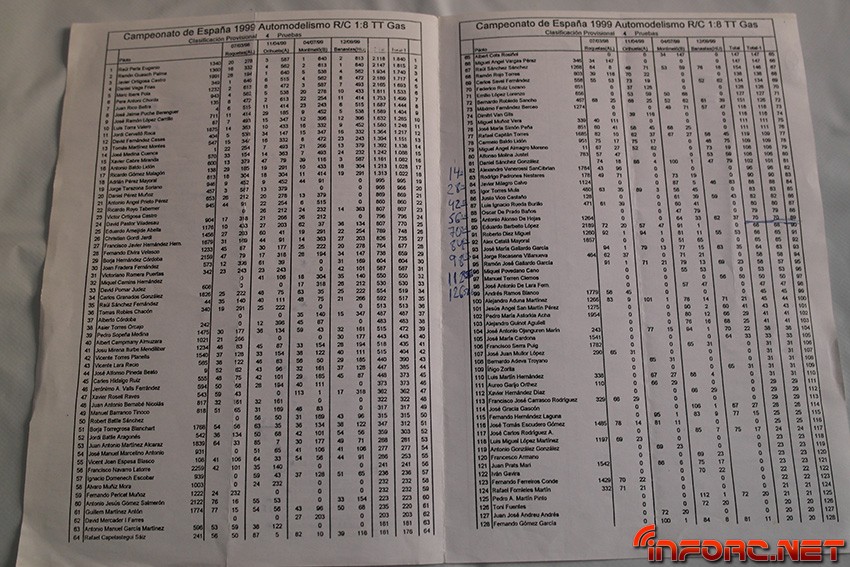 Entre los nombres que pueden encontrarse en las listas de pilotos y clasificaciones se leen muchos conocidos, algunos de ellos actualmente en activo como pilotos y otros, involucrados con el RC de algún modo, sea en labores organizativas o comerciales. Echad un ojo y seguro que encontráis nombres que os suenan o conocéis como Raul Peris, Dani Vega, Marc Ibars, Cristian Gordi, Antonio Baldo (padre de los hermanos Baldó), Jaime Puche…¡Historia viva del RC en España, no os lo perdáis!