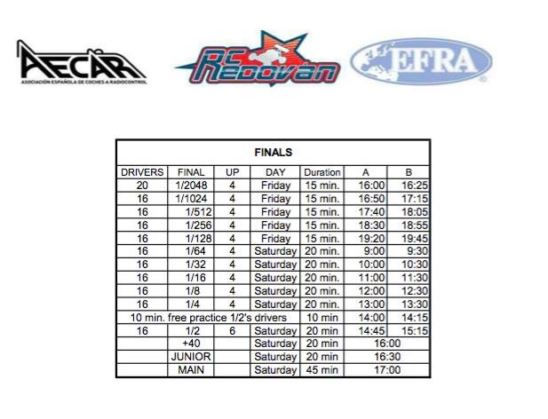Como se muestra en la tabla, el martes y miércoles están reservados exclusivamente a tandas de entrenamientos para que los pilotos se adapten al circuito de Redován, añadiendo el miércoles el reseeding (recolocación). Las finales comienzan el Viernes y acaban el Sábado. Estad atentos durante toda la semana a infoRC.net y no os perdáis nada 😀
