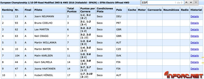 Ayer finalizó en Valladolid el Campeonato de Europa 1/10 off road que se ha celebrado esta semana en las modalidades de 1/10 2WD y 4WD. Mientras que en 2WD fue Neil Cragg quien se llevó el gato al agua, Jorn Neumann ha vuelto para reclamar lo que es suyo y se ha llevado el título de Campeón de Europa 4WD después de quedarse muy cerca de llevarse también el de 2WD. Le han seguido en el podio Bruno Coelho y Lee Martin.