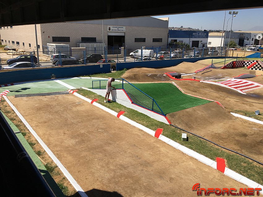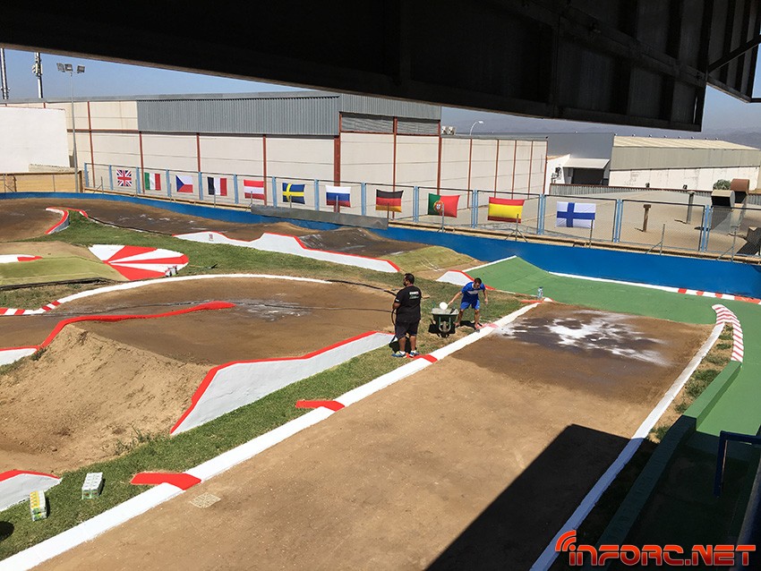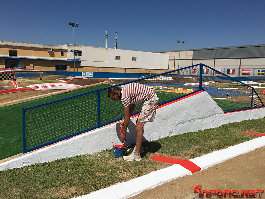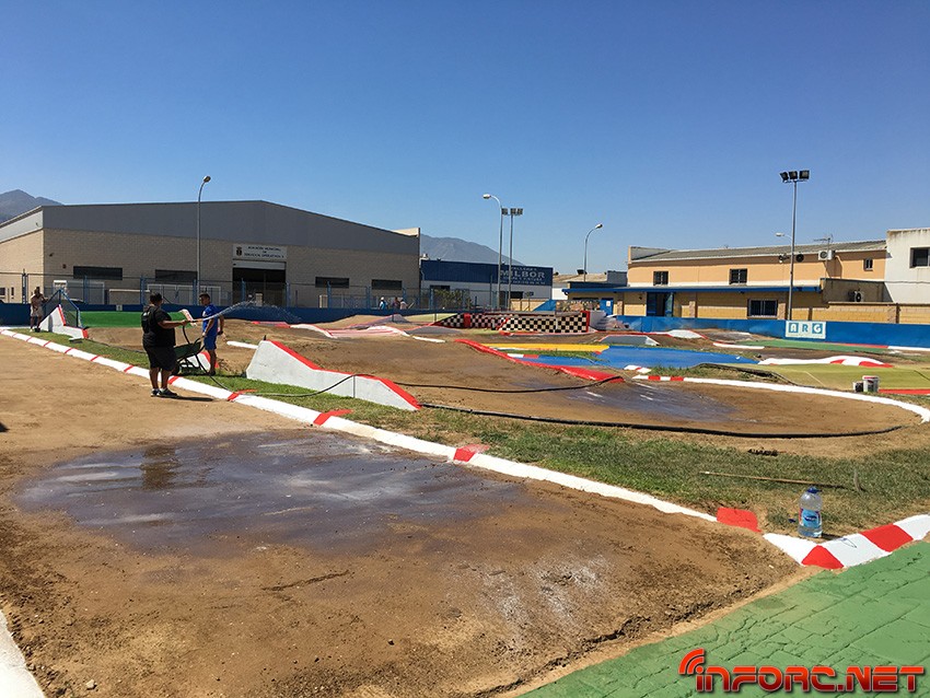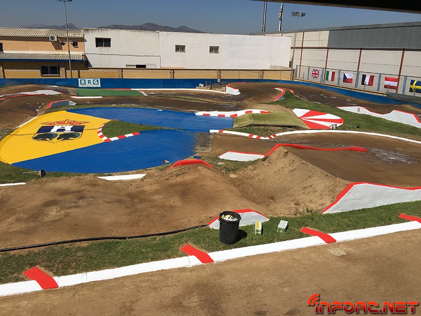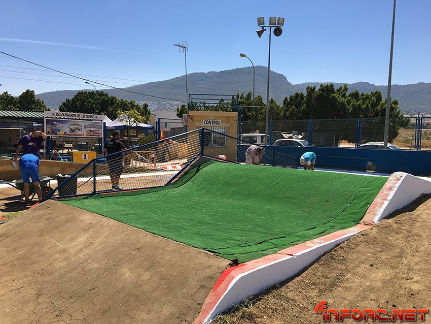 El acabado que han conseguido con la superficie del trazado los socios del Club RC Alhaurín de la Torre es espectacular, con un terreno muy compactado y liso en el que además se encuentran hoy esparciendo azúcar para aumentar el agarre y la resistencia del mismo durante toda la duración del evento. Se han añadido además algunas modificaciones para la ocasión, como la valla de seguridad instalada en el salto doble justo antes de la línea de transponder, evitando que los coches puedan meterse en sentido contrario. Se han instalado carpas adicionales en todo el recinto que junto con la decoración y banderas propias de un Camp de Europa, transmiten un ambiente de competición que hará vibrar a partir de mañana a los asistentes.