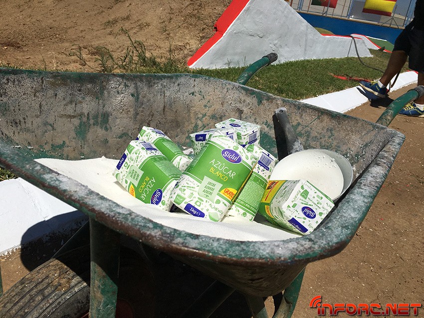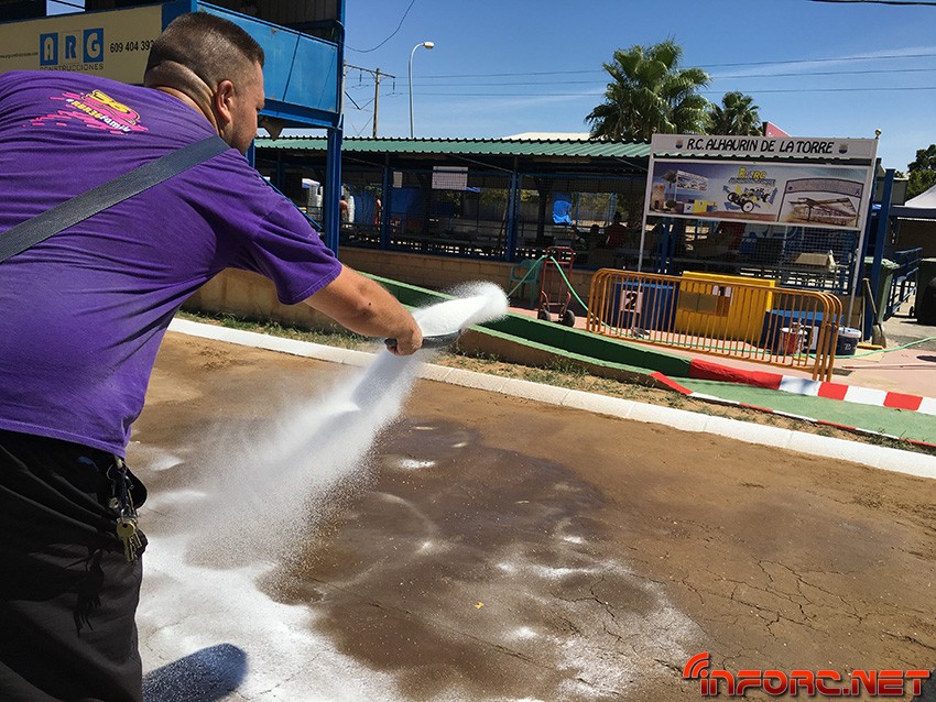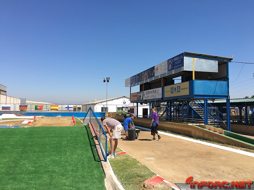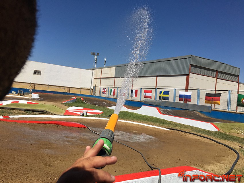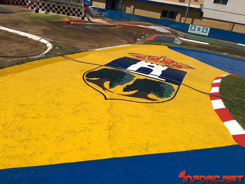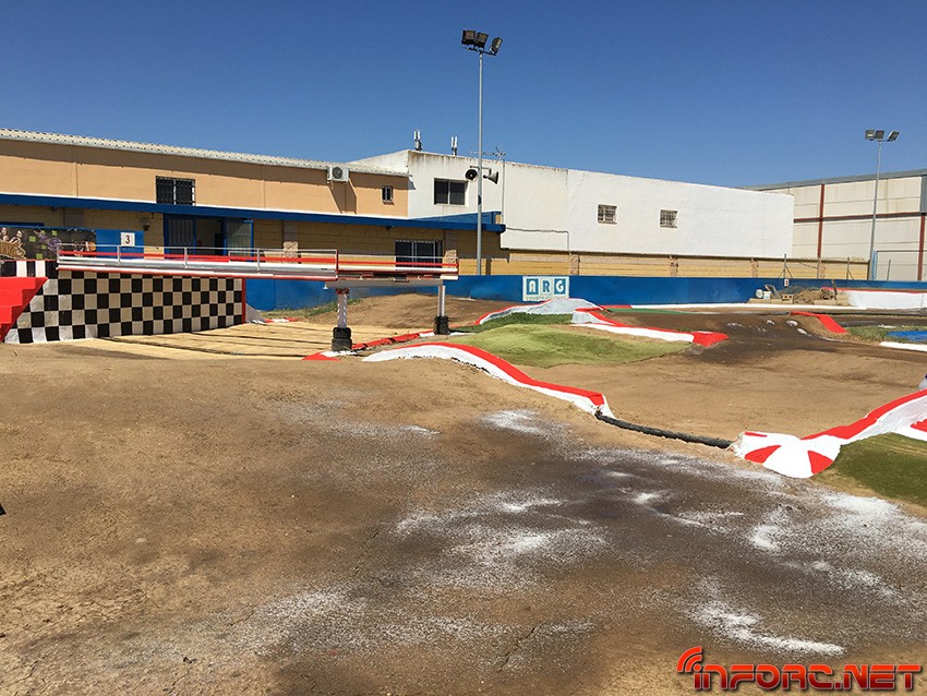 El acabado que han conseguido con la superficie del trazado los socios del Club RC Alhaurín de la Torre es espectacular, con un terreno muy compactado y liso en el que además se encuentran hoy esparciendo azúcar para aumentar el agarre y la resistencia del mismo durante toda la duración del evento. Se han añadido además algunas modificaciones para la ocasión, como la valla de seguridad instalada en el salto doble justo antes de la línea de transponder, evitando que los coches puedan meterse en sentido contrario. Se han instalado carpas adicionales en todo el recinto que junto con la decoración y banderas propias de un Camp de Europa, transmiten un ambiente de competición que hará vibrar a partir de mañana a los asistentes.