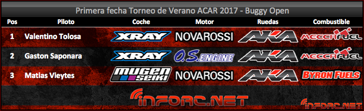 La final de Buggy Open fue dominada ampliamente desde sus comienzos por el joven piloto de Capital, Matías Vieytes, hasta que lamentablemente una avería cerca del final (de embrague por lo que se comentaba) no le permitió terminar, finalizando así 3º. Relevando la victoria a otro joven piloto, el pequeño Casarense Valentino Tolosa, seguido por el segundo lugar otro excelente piloto de Capital, Gastón Saponara.