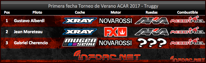 Por último la gran final de Truggies fue ganada (otra vez) por el veterano piloto Gustavo “El colo” Alberdi, el cual mantuvo lucha con Jean Moreteau durante media carrera, hasta que lamentablemente una avería electrónico le impidió a Jean terminar (finalizando 3º). Destacar también al Debutante de la ciudad de Luján Gabriel Cherencio que finalizó en segunda posición con un excelente manejo.
