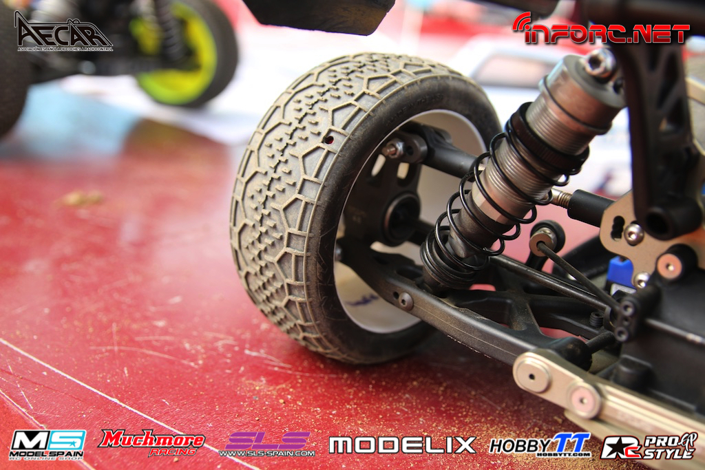 El suelo se ha ido secando con el paso de los coches y ahora el agarre es más constante y sin tantos enganchones, por lo que el vuelta a vuelta es más suave. He probado las AKA Typo en compuesto Clay y es lo que estoy usando actualmente. Estoy contento con la electrónica nueva, aunque corre demasiado. Estoy montando actualmente el 2150.