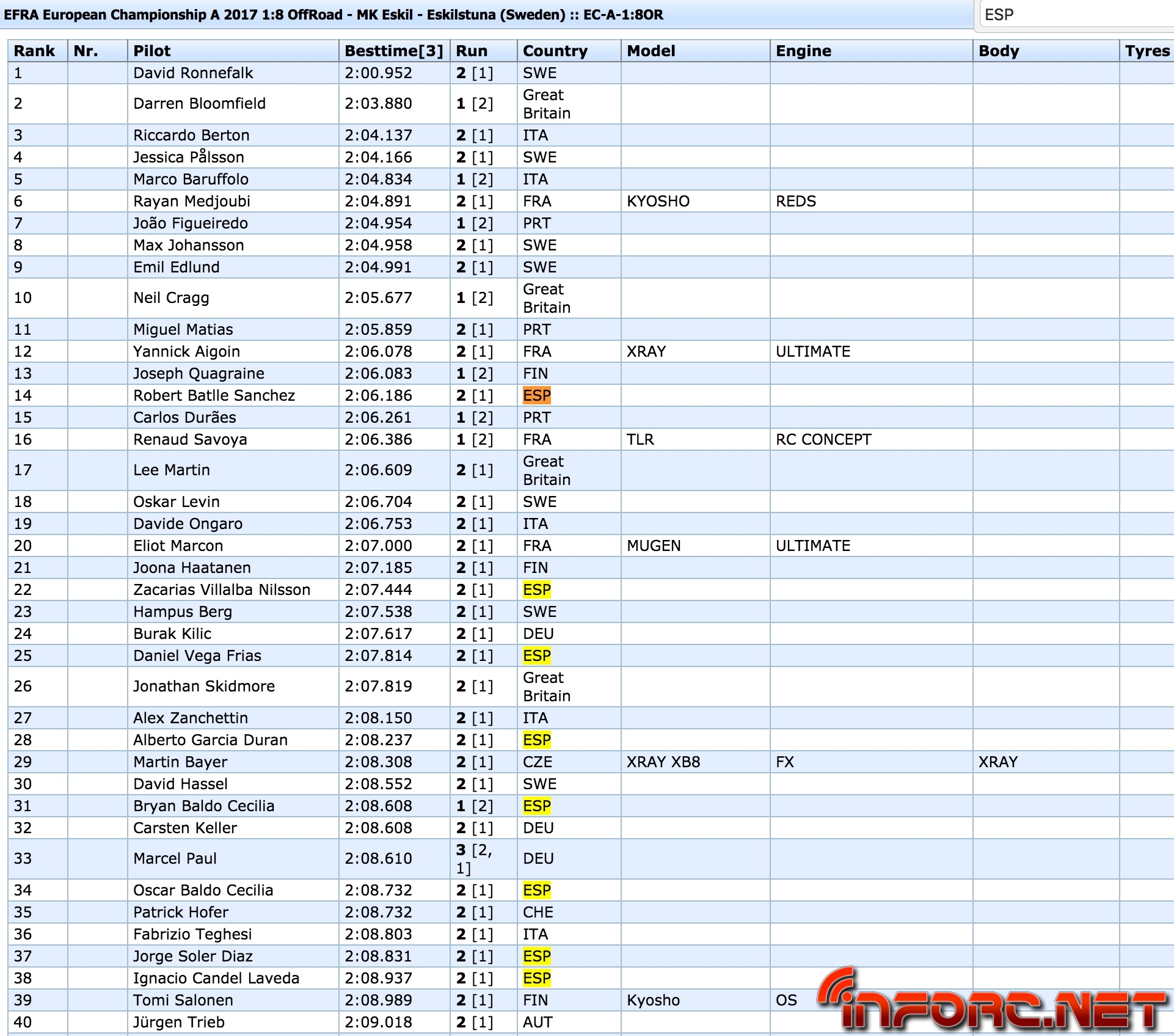 Cumpliendo con las expectativas que recaen sobre él, David Ronnefalk se encuentra en estos momentos en primera posición de las mangas de entrenamiento, aunque le sigue muy de cerca, a tan solo 3 segundos, Darren Bloomfield. Recordemos que este ranking se basa en el tiempo de las tres mejores vueltas. El primer español que encontramos en la tabla es Robert Batlle en 14 posición.