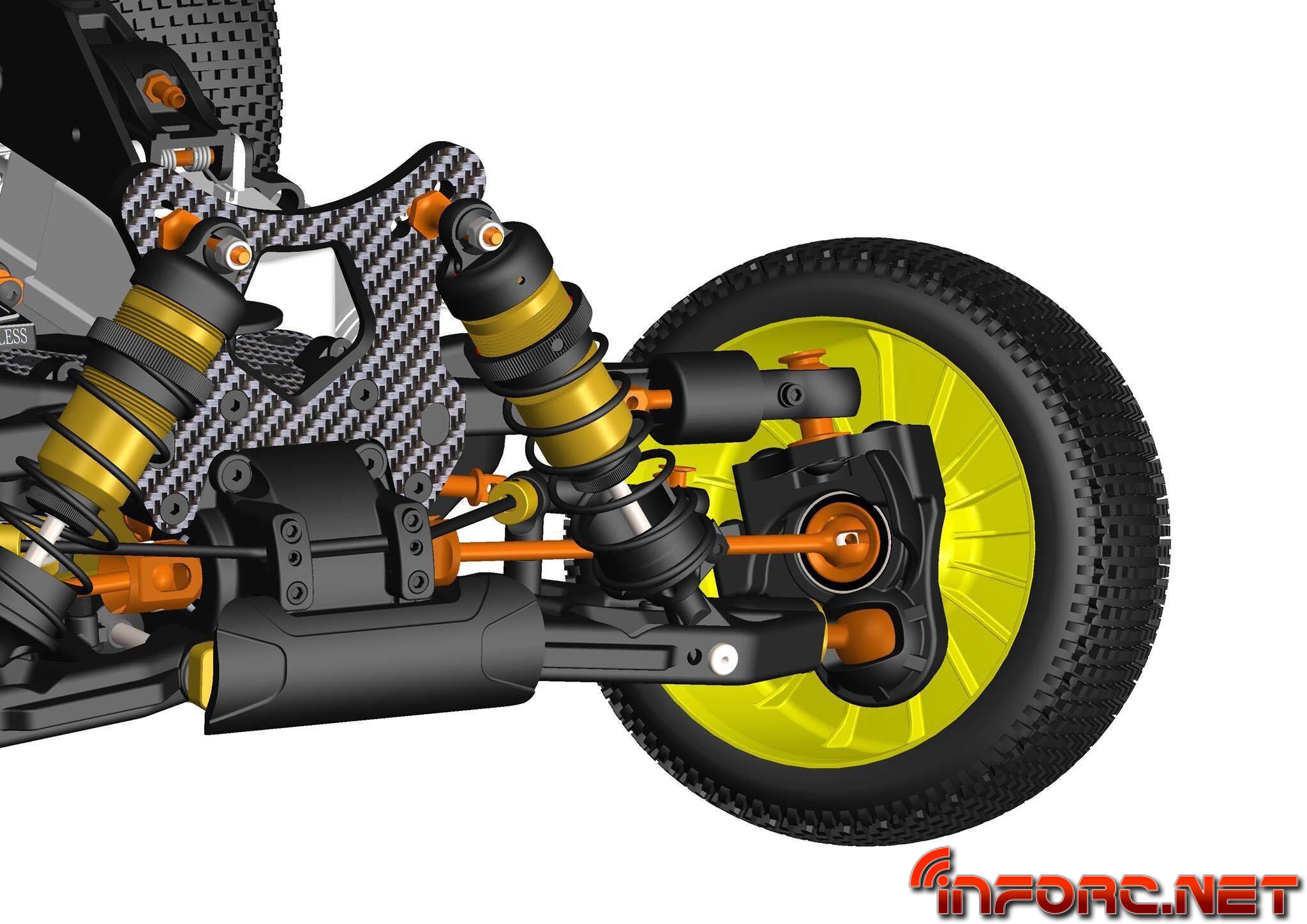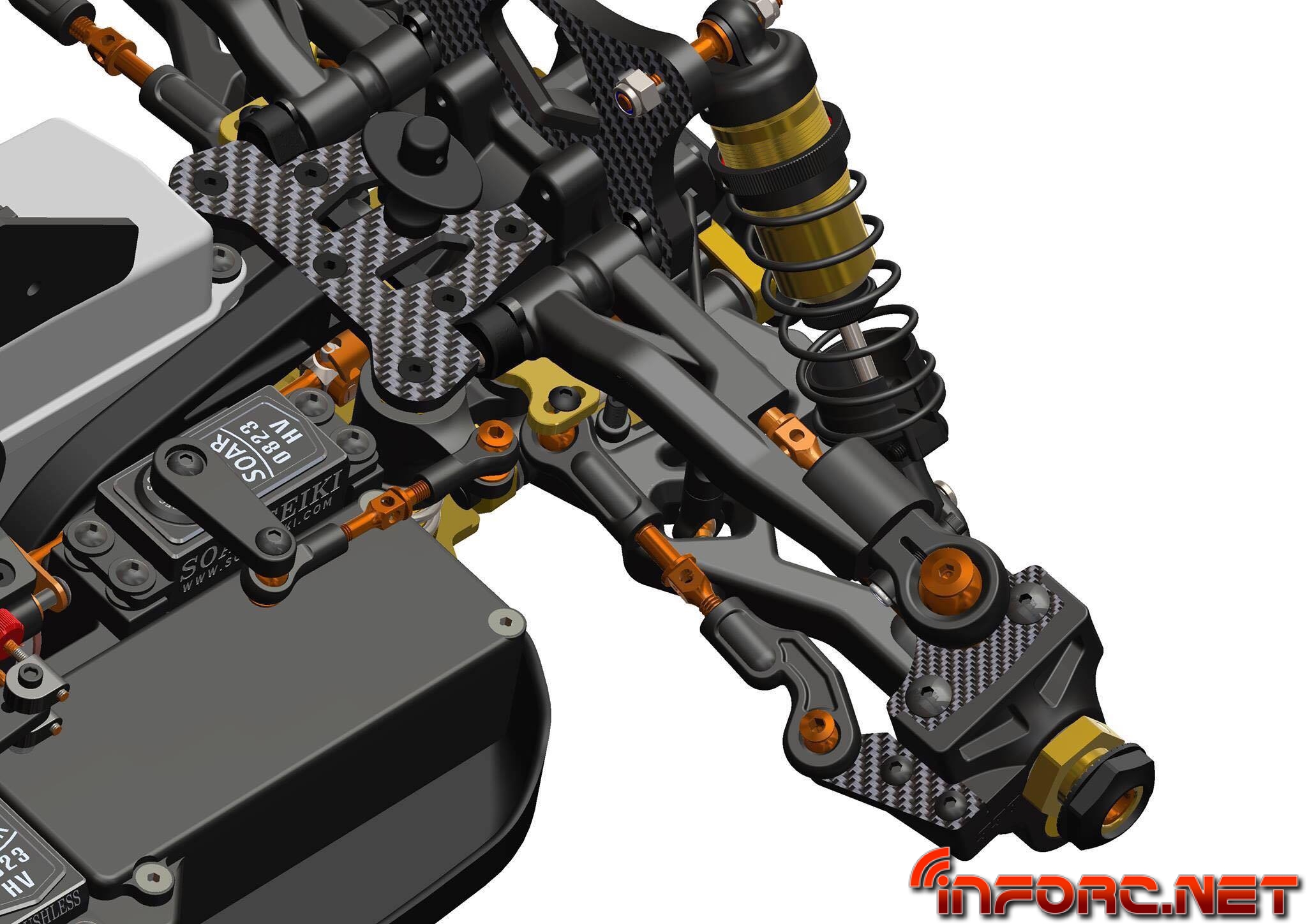 Cuenta con sistema de casquillos para regular todas las placas de geometrías de trapecios, facilitando una puesta a punto rápida y sencilla, además vemos que en su parte trasera incorpora lo que parece un peso justo bajo el cardan central trasero. Por otra parte la marca apuesta por el carbono sobre el aluminio para las mariposas, araña del salvaservos y placas en las manguetas.