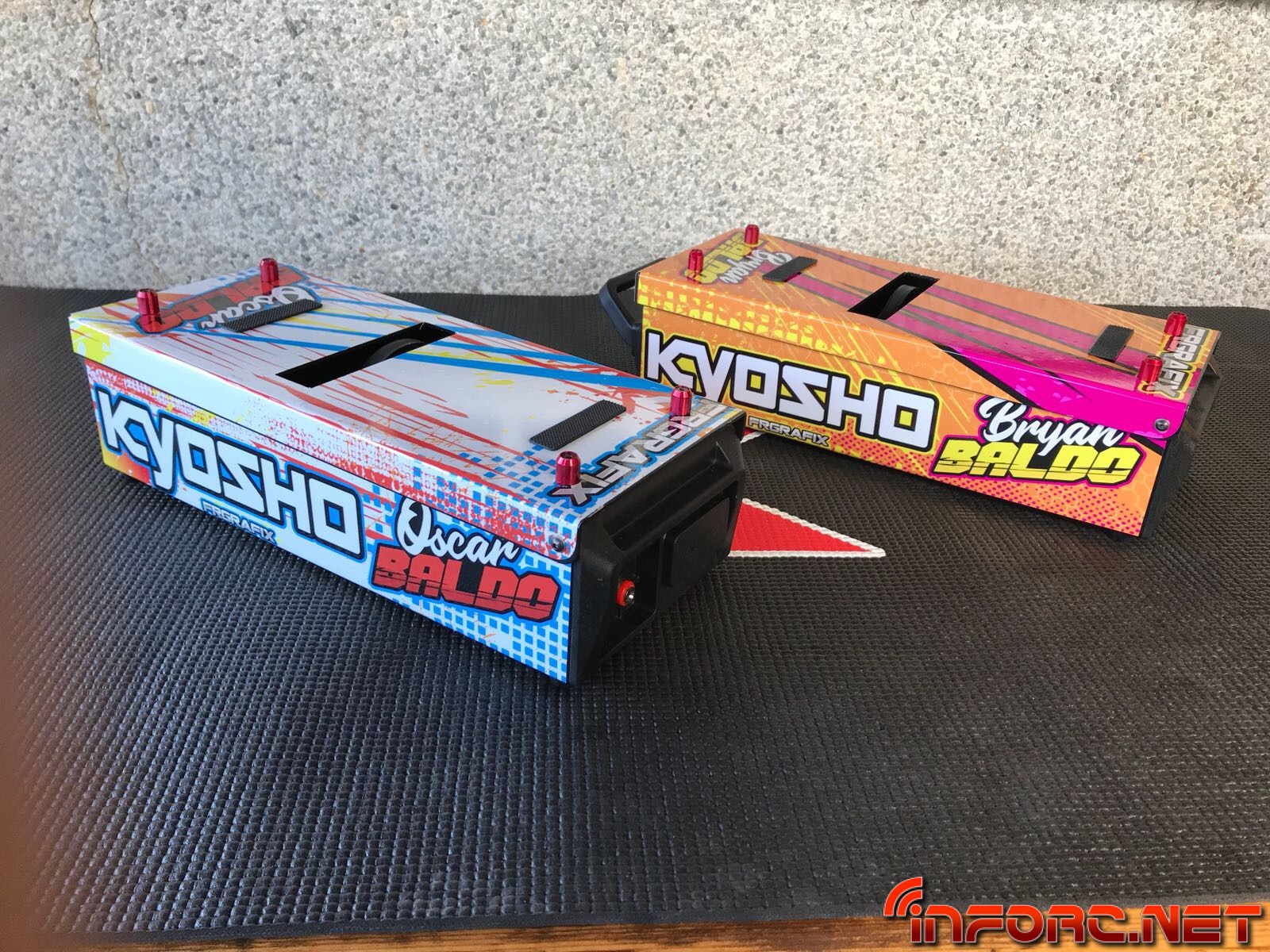 Alerones personalizados con sus marcas y diseños propios, emisoras inconfundibles en el circuito y unas mesas de arranque que destacan en el box, son solo algunas de las novedades que Frgrafix ha preparado para Bryan y Oscar Baldo, que ya llevan sus nuevos Kyoshos actualizados con su nueva personalización.