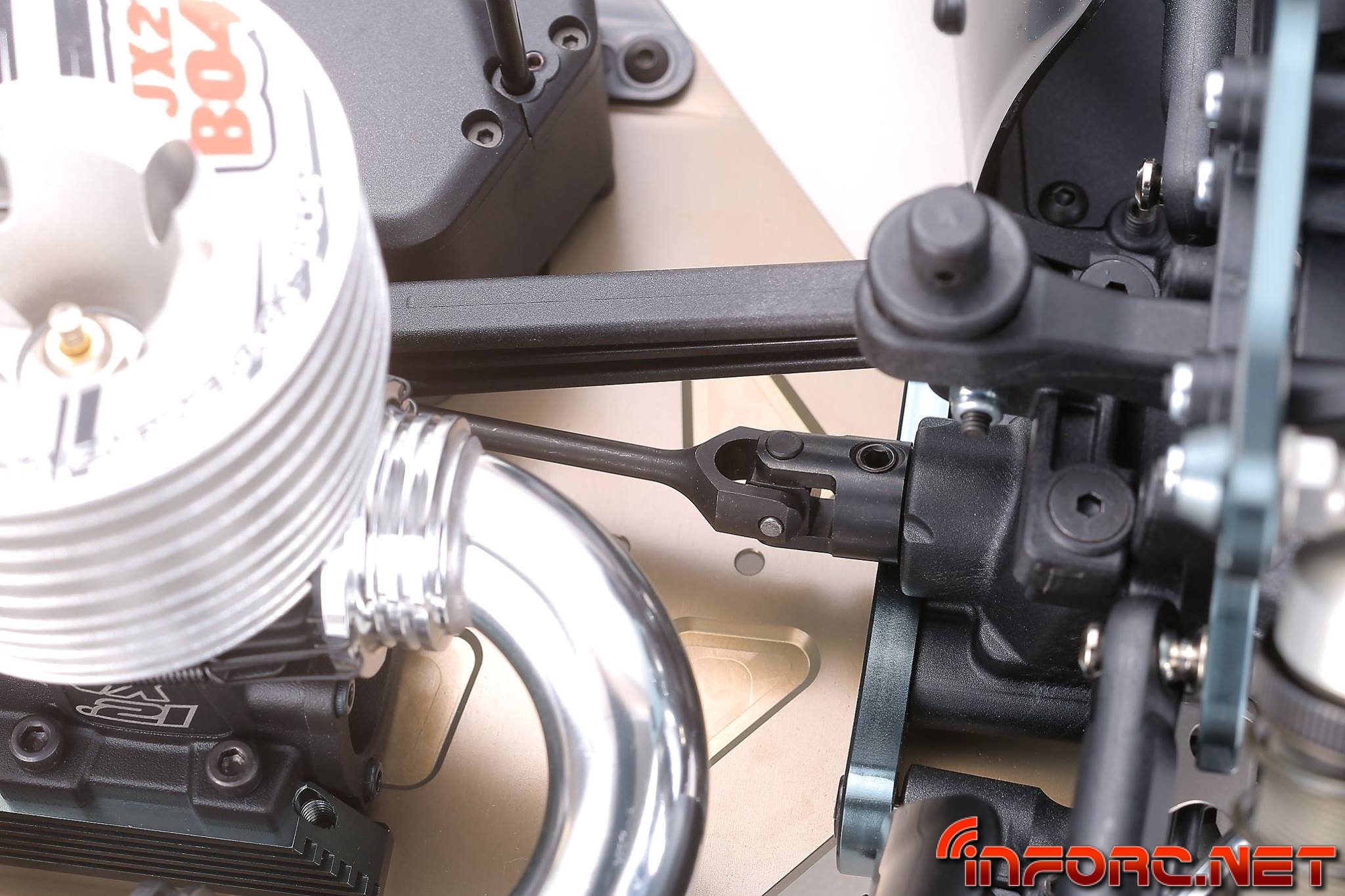 En el nuevo Mugen MBX8 los piñones de ataque son de corte recto, mejorando la aceleración y los consumos. De esta forma la transmisión va mas suelta, mejorando además la velocidad en el paso por curva.
