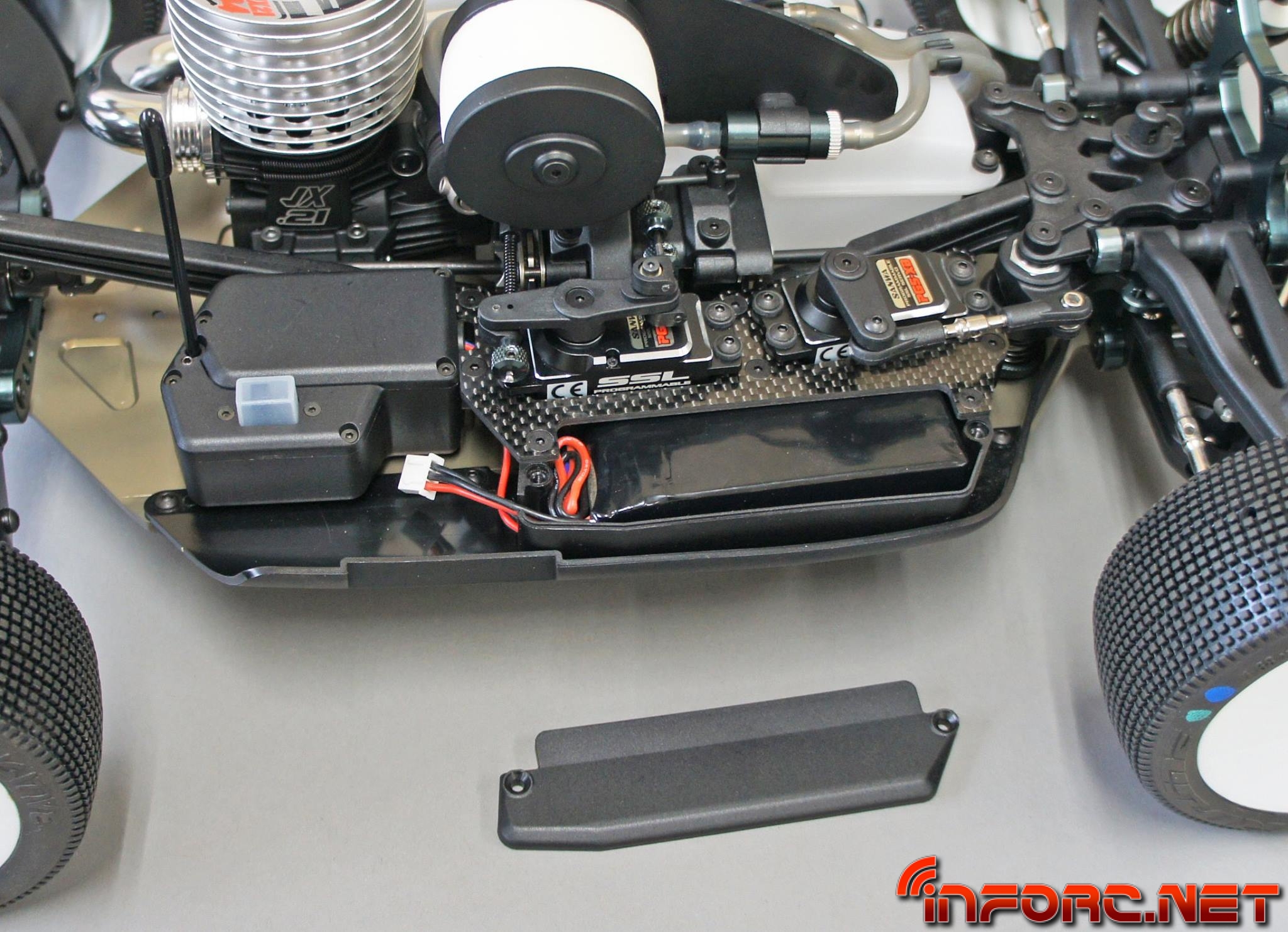 - El nuevo MBX8 sigue pensado para usar LiPos o LiFes planas de 2S, pero ahora cuenta con una caja en la que introducirlas. La caja de baterías permite fácil acceso y cambio de la batería, ayudando además a protegerla de impactos fuertes. Se ancla en una bandeja de servos actualizada de fibra de carbono.