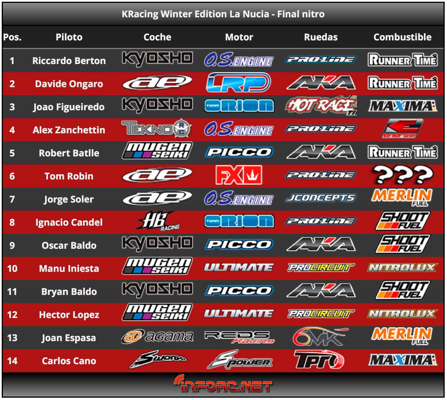 Tras un magnífico fin de semana de carreras en la KRacing Winter Edition La Nucia, quedan finales tan espectaculares como estas que hoy os traemos comentadas junto a Robert Batlle. En la final nitro hay varias vueltas de lucha por la primera posición entre varios pilotos, primero entre Figueiredo y Ongaro y luego entre Ongaro y Berton, sumandose en algunos momentos Tom Robin formando una preciosa lucha a tres entre pilotos de gran nivel. Algo más atrás en la final podemos disfrutar con otros piques de buen nivel.