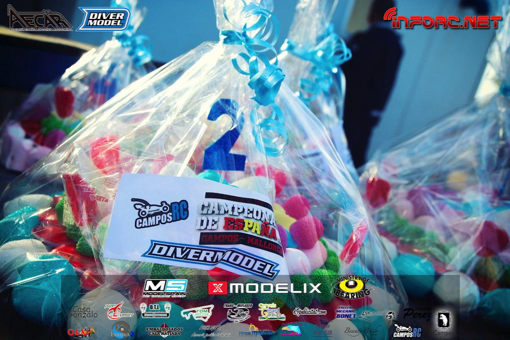 Queremos aprovechar para felicitar a Divermodel por su estupenda labor para fomentar el RC en Mallorca, que ha crecido exponencialmente desde que comenzaron este gran proyecto. Como gestores del club Campos RC han demostrado ser formidables y como organizadores de Campeonatos Nacionales, en los que son prácticamente veteranos ya a pesar de la corta edad de su empresa, estar a la altura de los mejores clubes de España. Lo demuestran con detalles como el que han tenido al acabar la jornada regalando productos del lugar a todos los participantes de la prueba, independientemente de su posición final.