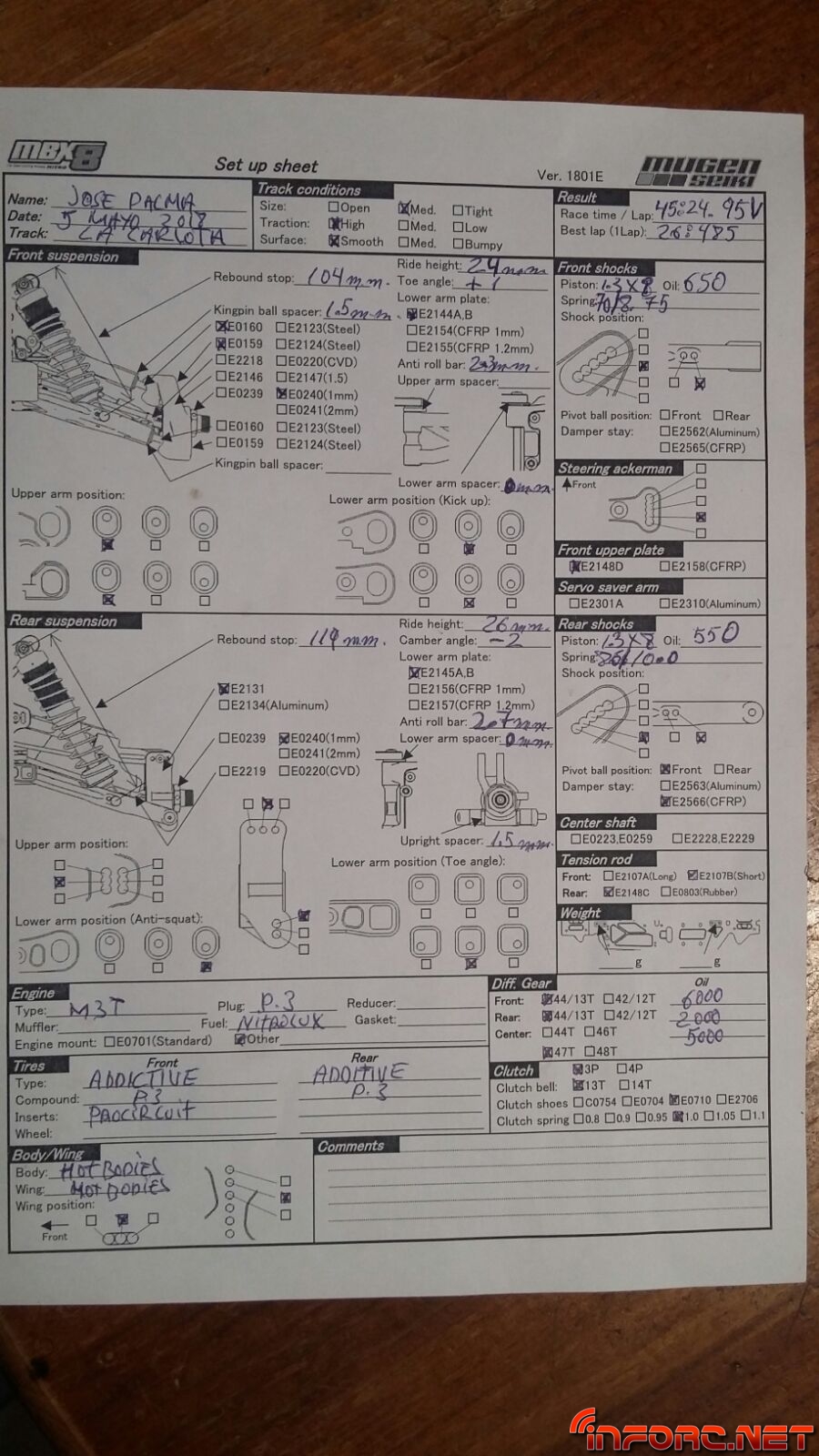 Mientras que Cano y Josemi optaron por llevar el diferencial central más cargado que el delantero y trasero, Jose Palma optó por unas siliconas de diferenciales algo más conservadoras. En los amortiguadores los tres se movieron en el rango de los 450 a los 650. Toda esta información y mucho más detalle de sus puestas a punto, podras ver en las hojas de reglaje que nos han mandado.