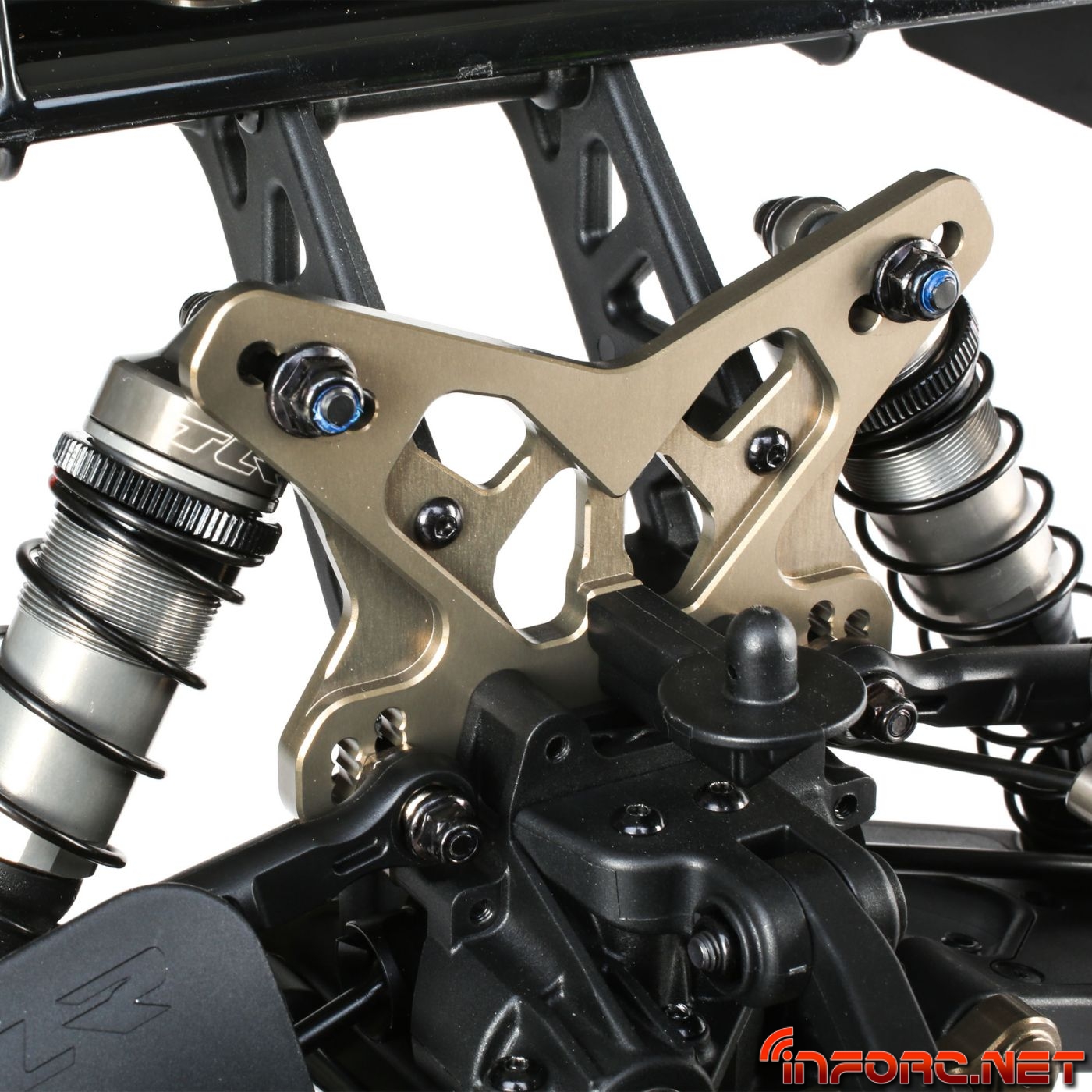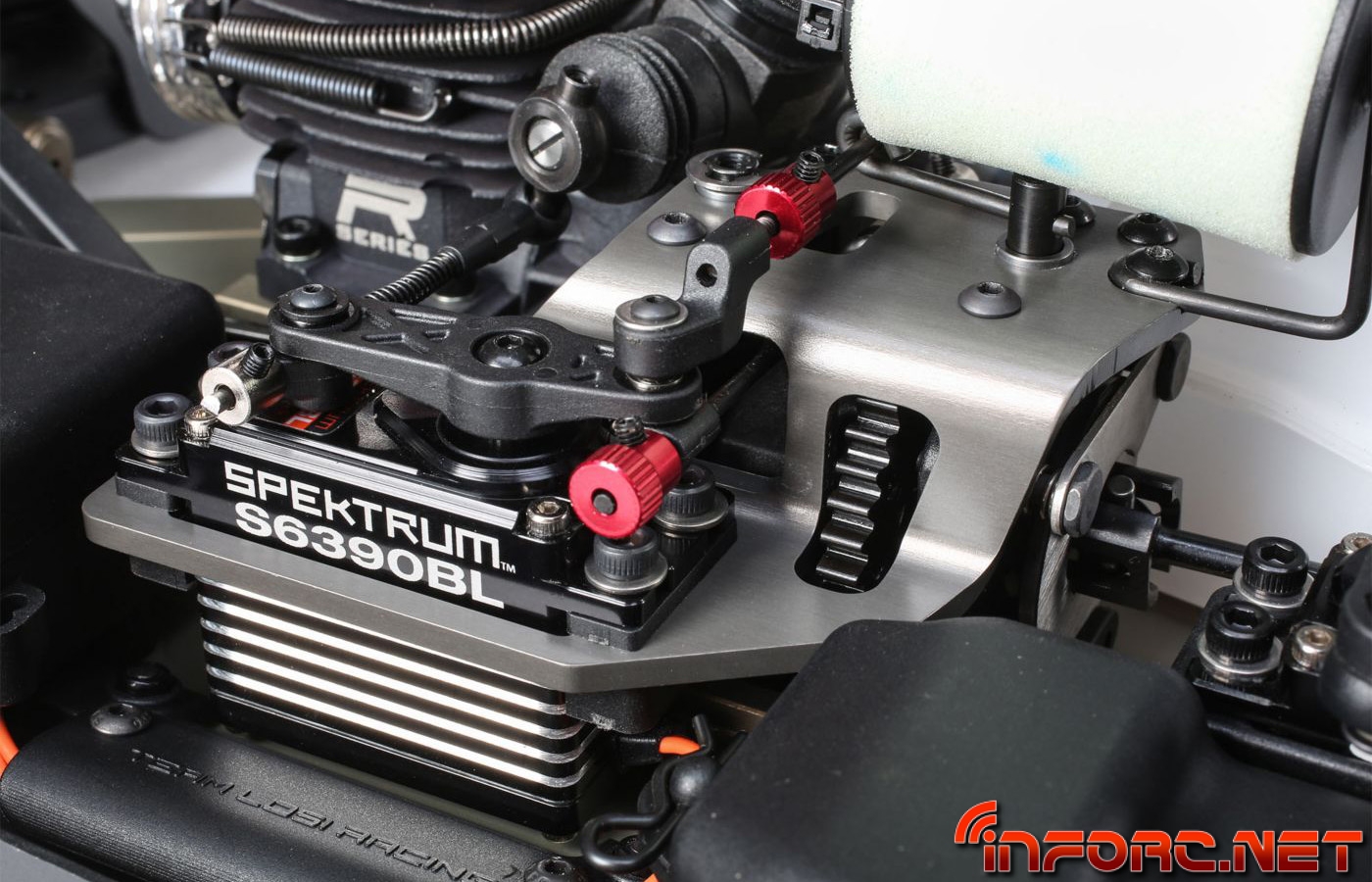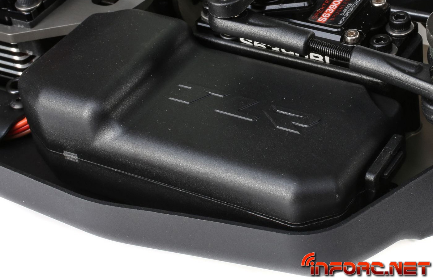 Una bandeja de radio actualizada permite ahora ubicar el servo de gas junto al motor para evitar tener que usar los reenvios de los modelos anteriores. La bandeja de radio actualizada asegurará el servo de gas con rigidez para evitar flexiones por estar el servo en suspensión. Por fin TLR en este modelo contará con tornillos de métrica en vez de pulgadas.