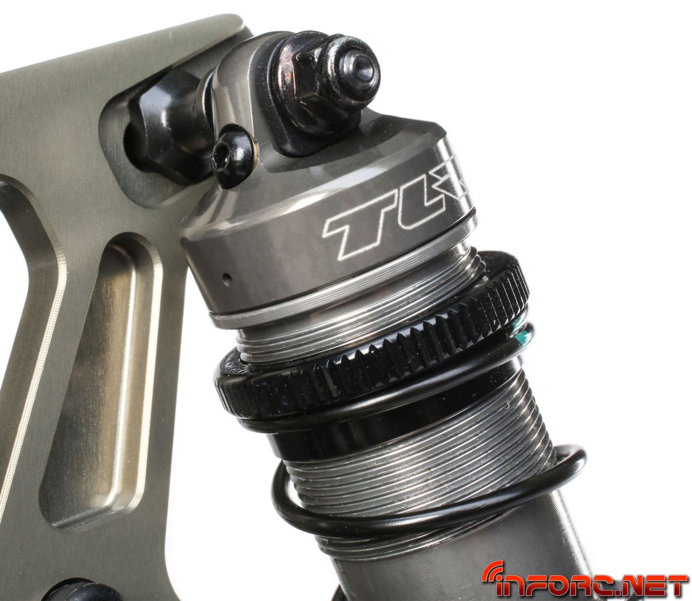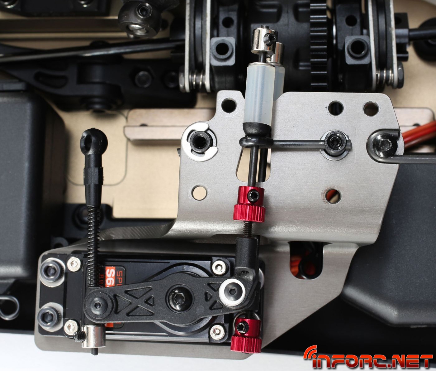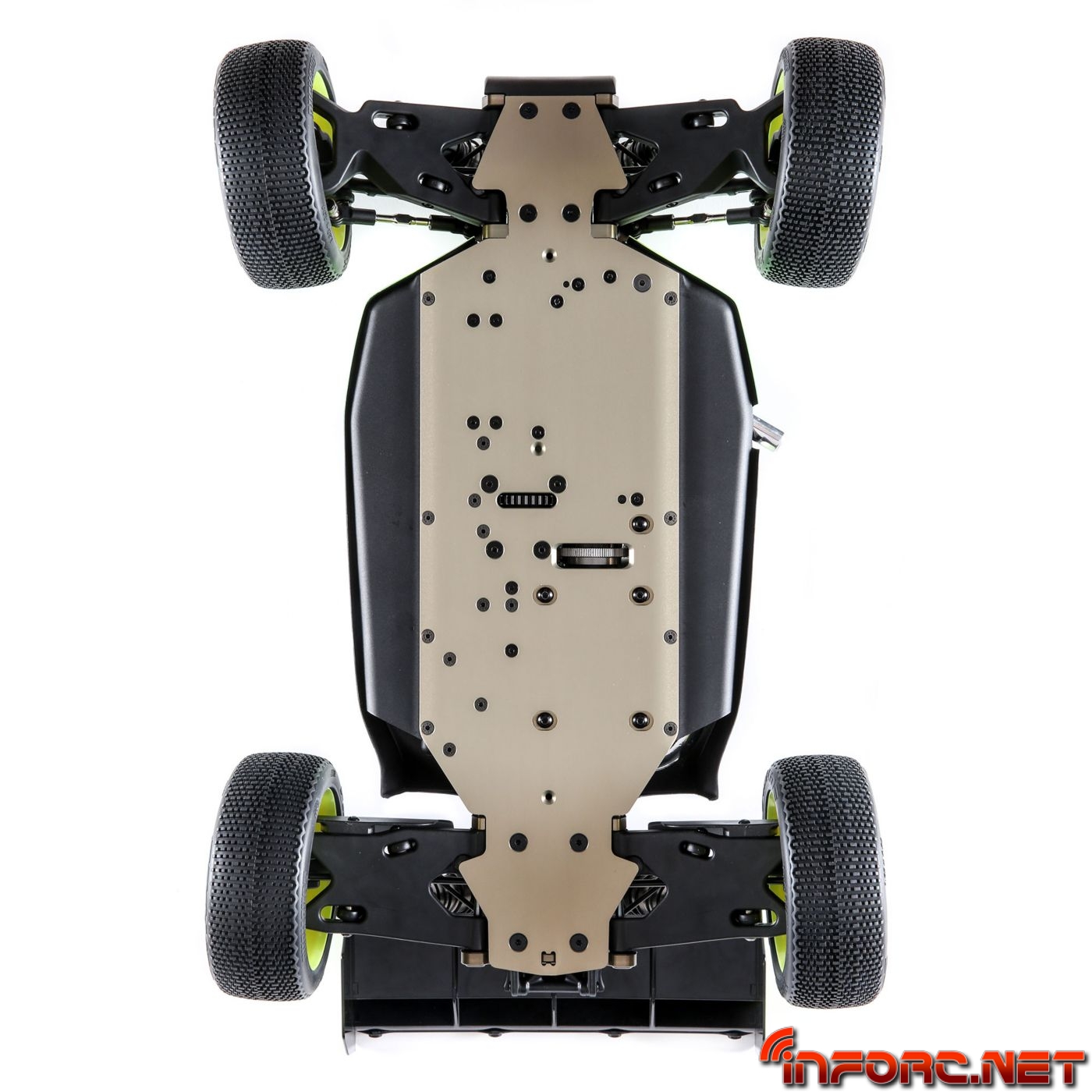 Una bandeja de radio actualizada permite ahora ubicar el servo de gas junto al motor para evitar tener que usar los reenvios de los modelos anteriores. La bandeja de radio actualizada asegurará el servo de gas con rigidez para evitar flexiones por estar el servo en suspensión. Por fin TLR en este modelo contará con tornillos de métrica en vez de pulgadas.