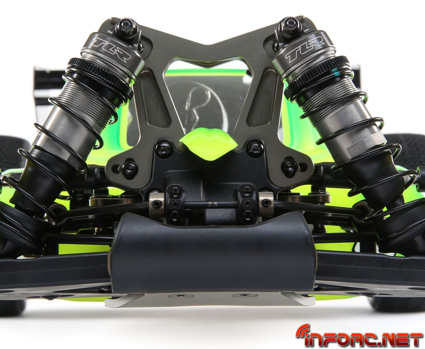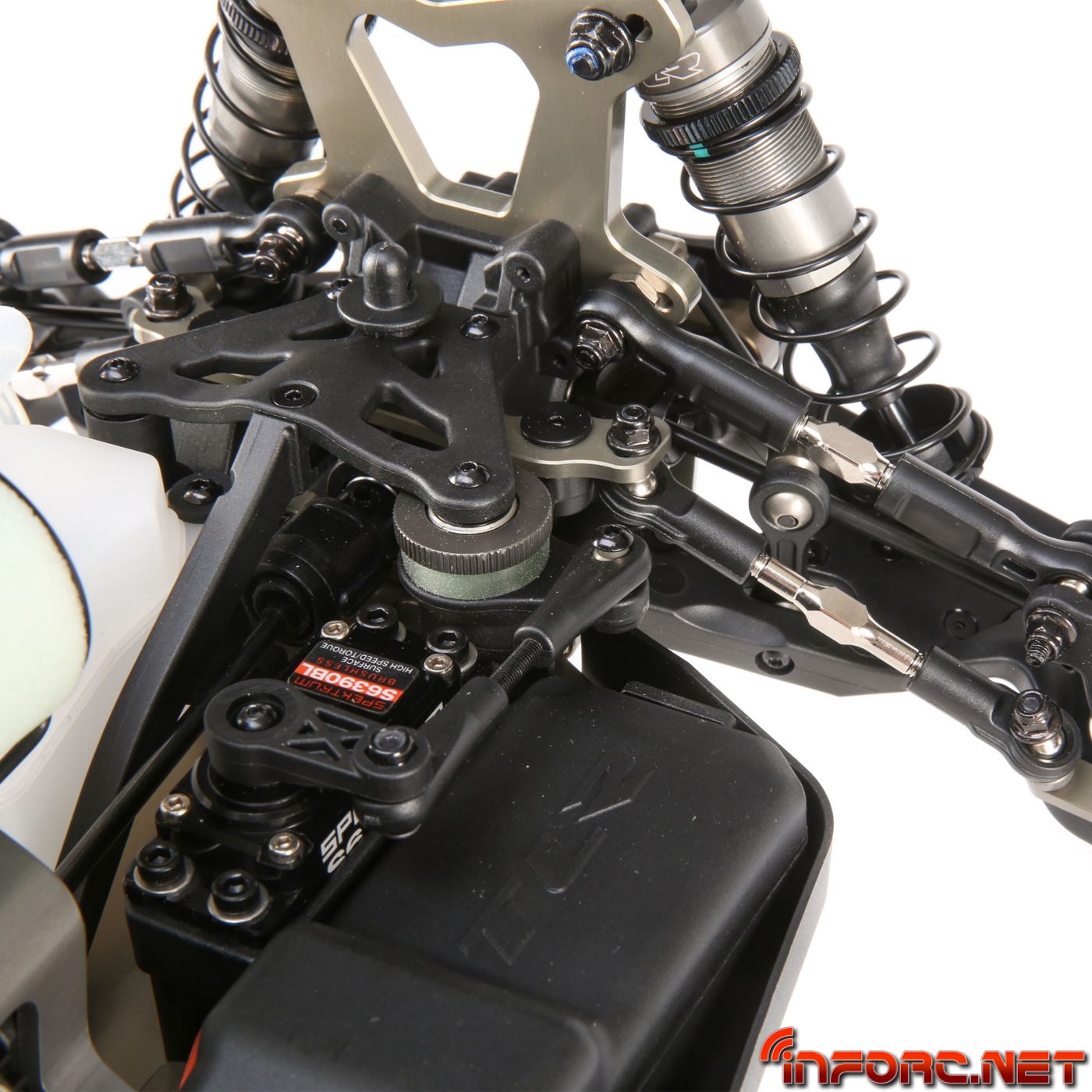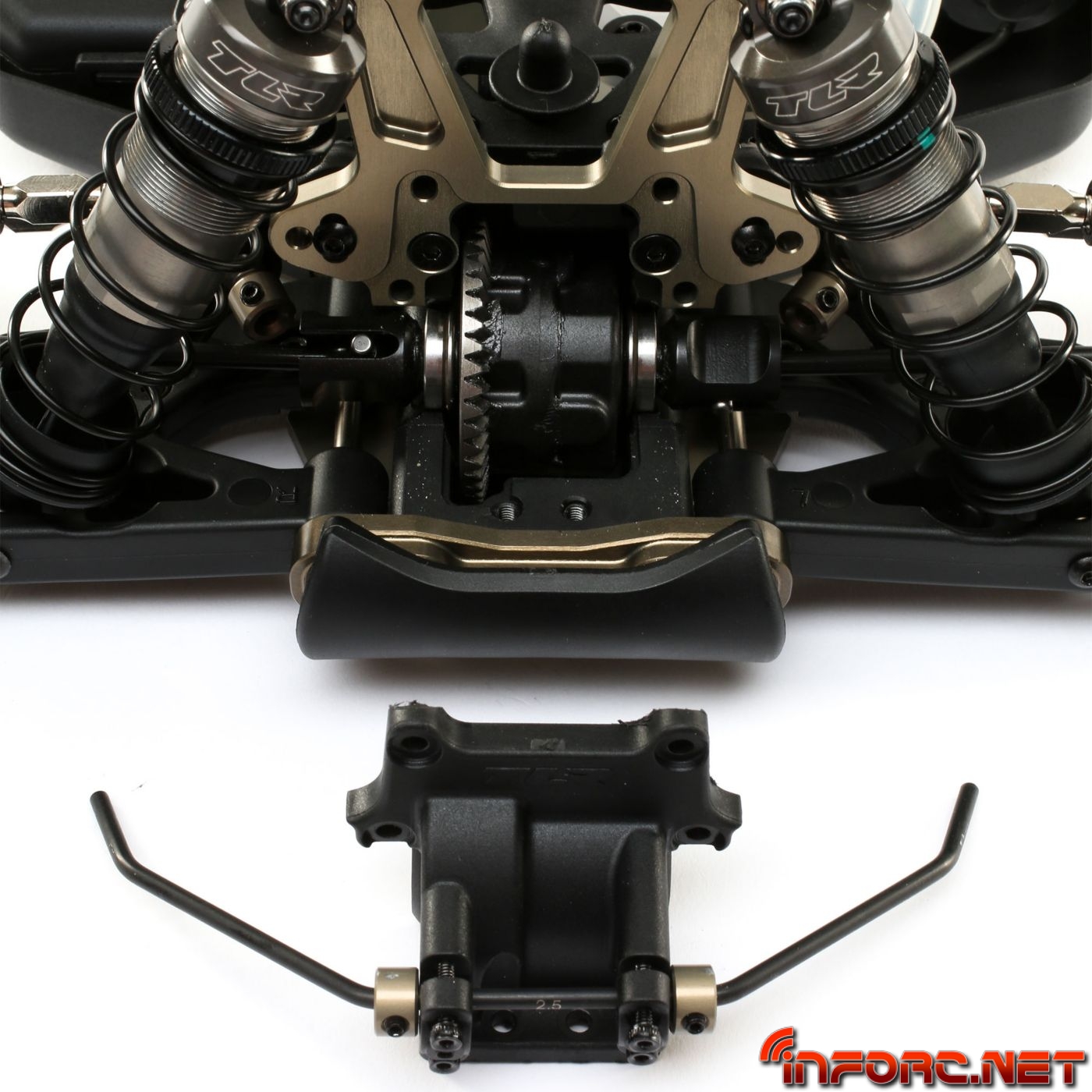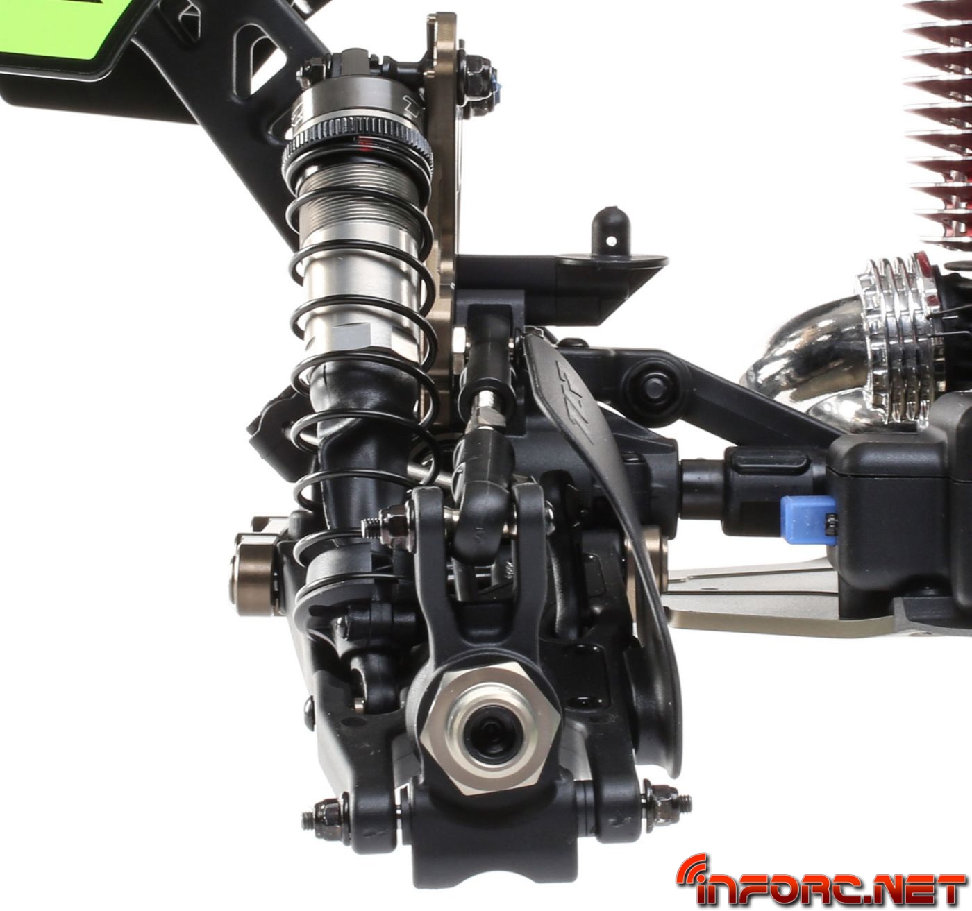 Las mariposas de aluminio 7075-T6 cuentan con nuevos orificios de ajustes para los tirantes así como un aumento en la altura de la trasera. Los amortiguadores cuentan con orificio de sangrado atornillado para mejorar el ajuste. Los amortiguadores se han aligerado para bajar el centro de gravedad y aligerar el coche, además de ofrecer la opción de usar vástagos de 3.5 y 4mm. Las cajas de diferenciales se han modificado para permitir instalar los diferenciales sin tener que desmontarlo todo del coche. Se puede acceder al diferencial central quitando solo cuatrotornillos superiores gracias a la bancada central de dos piezas.