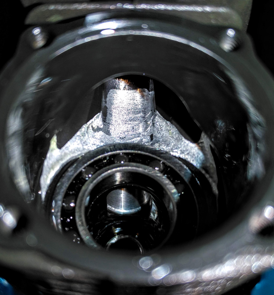 En este caso podemos ver el trabajo realizado manualmente en el cárter para agilizar la admisión de fluidos al equipo motor, también podemos observar el rodamiento cerámico instalado en este motor, se trata de un rodamiento que se monta a mano y se seleccionan las bolas una a una para garantizar la perfección de funcionamiento del mismo.